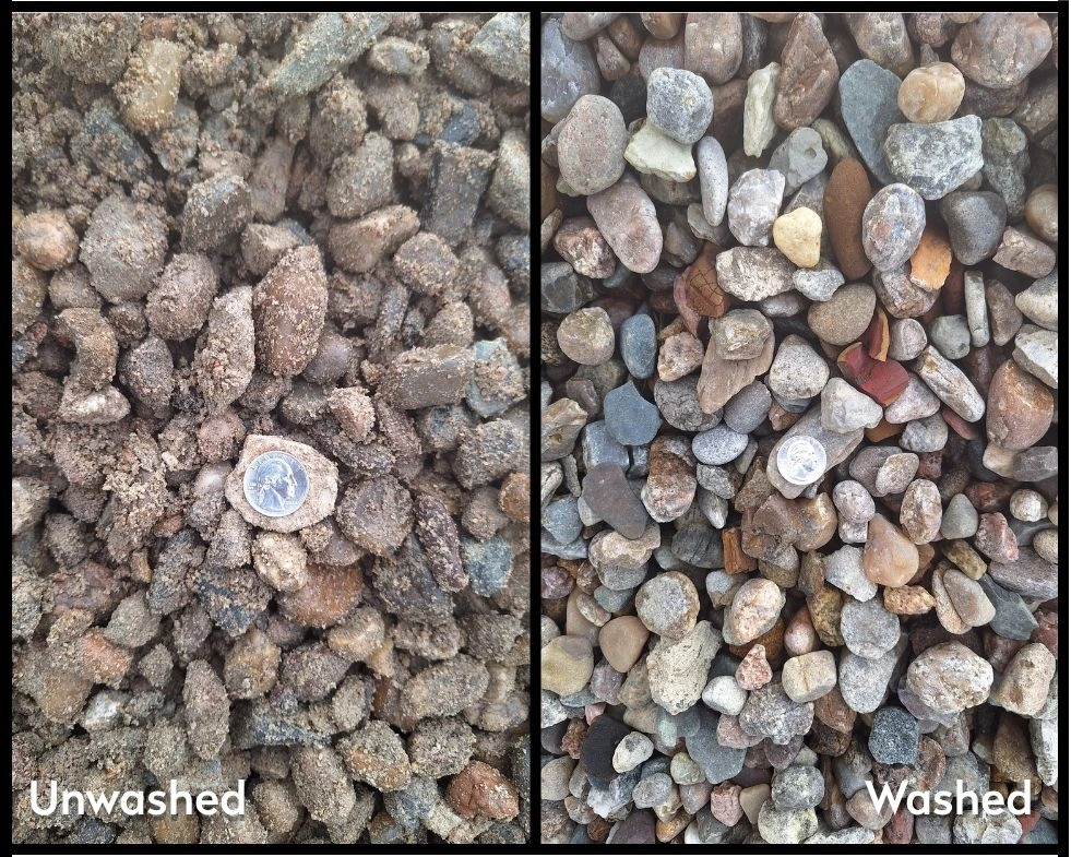 Approximately 1″ in size – see quarter in photo for reference. This rock is multi-colored with a variety of shapes and textures for visual interest. The left photo shows the rock Unwashed. The right photo shows what the rock will look like after hosed off.